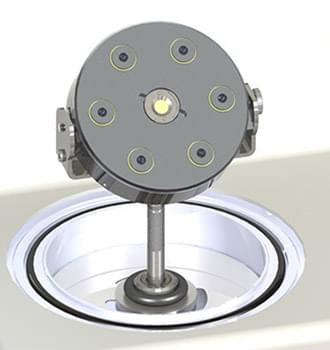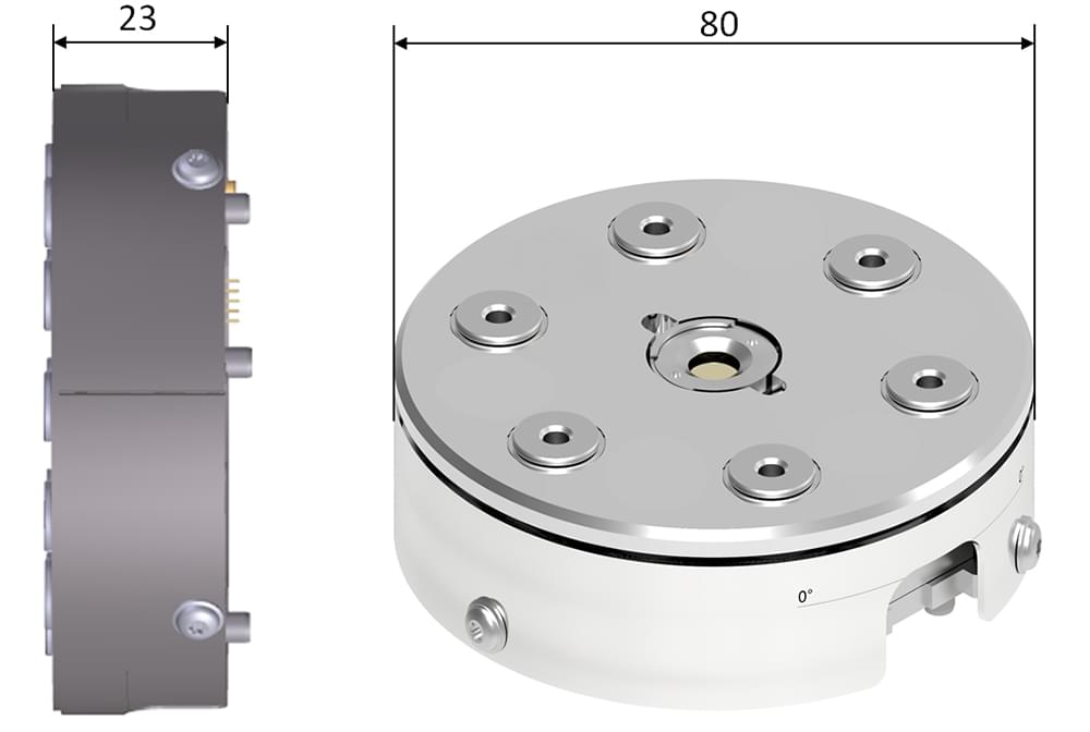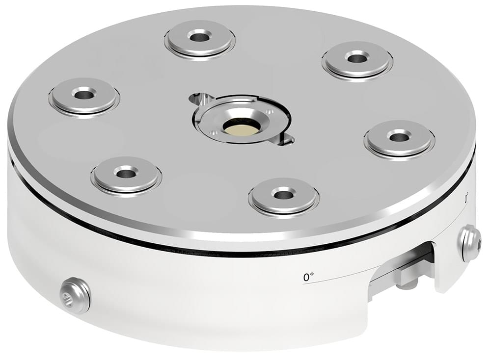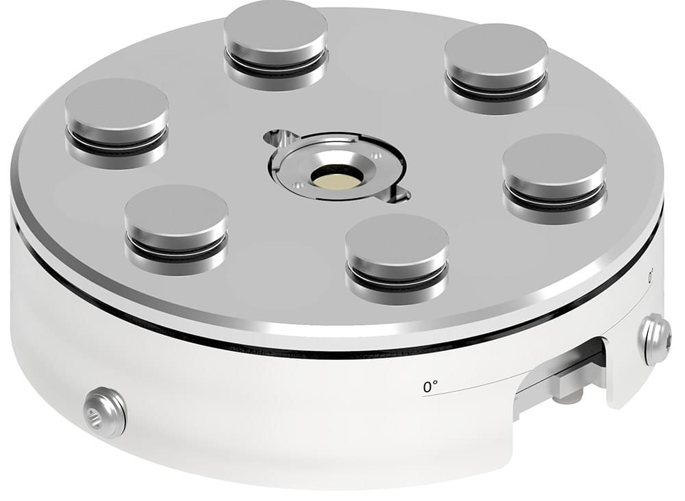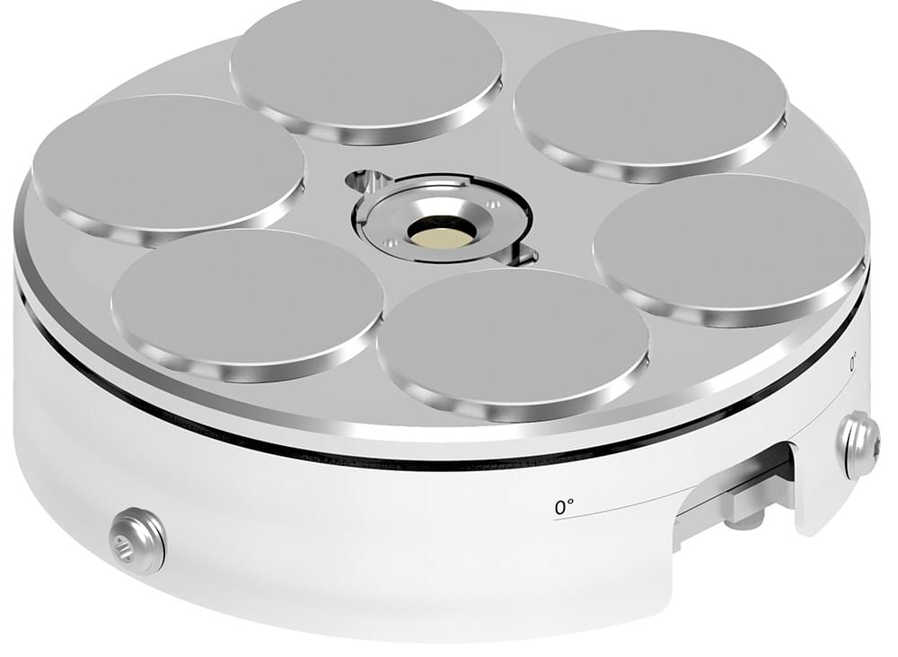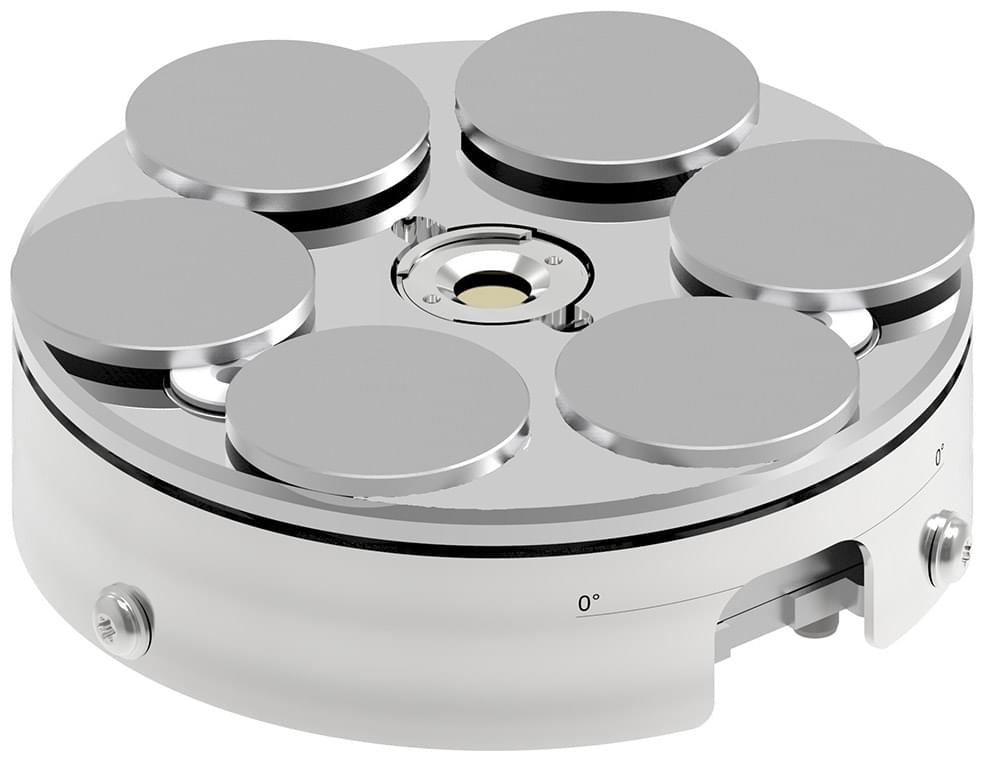 The optional rotary table is attached to the existing stage of the basic unit. An automatic table recognition and speed control (0 ... 100 %) is already integrated into the software of the basic unit. The table can hold a total of 20 sample stubs. Simultaneous placement of 5 large stubs with a diameter of 25.4 mm or 10 small stubs with a diameter of 12.7 mm is possible.